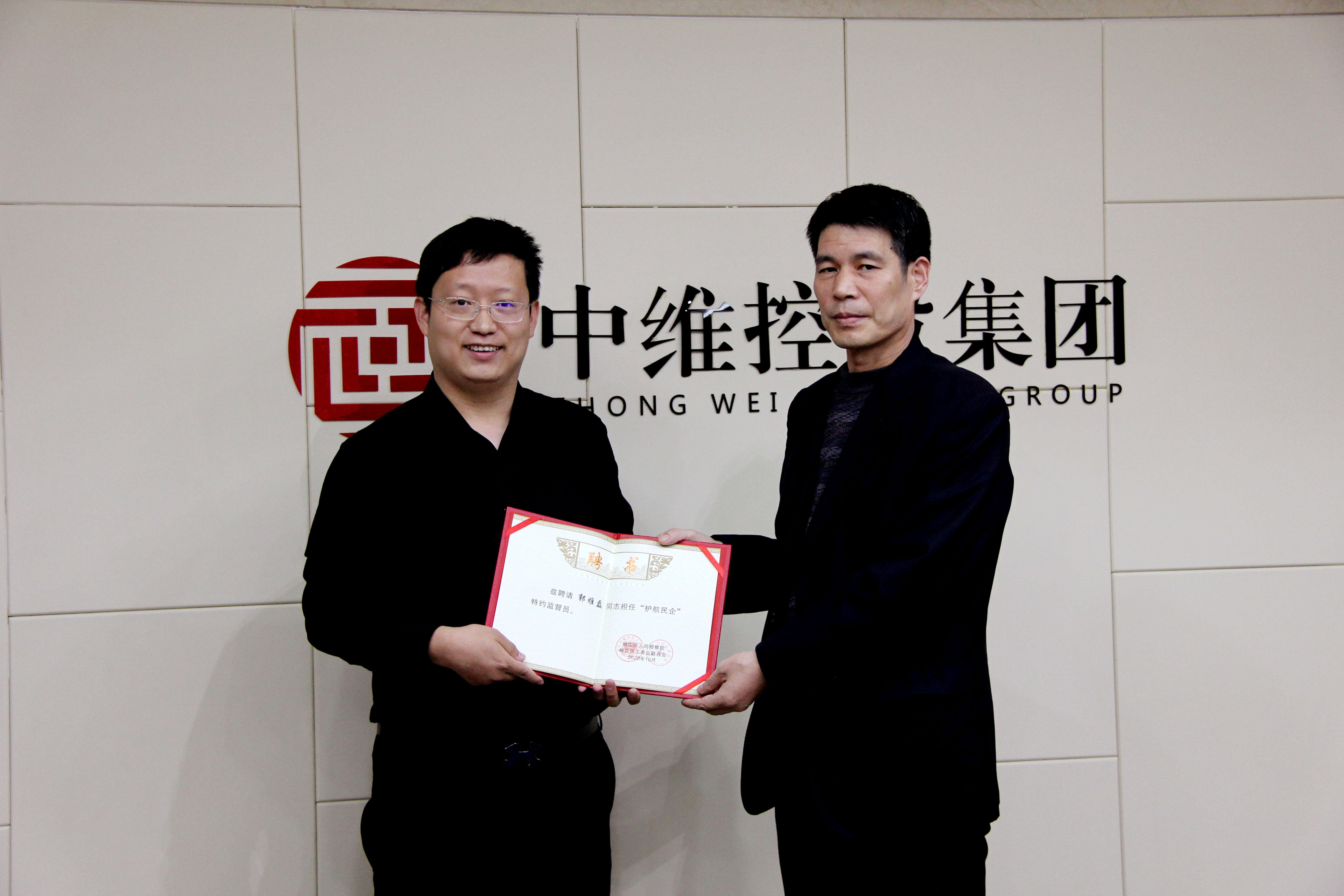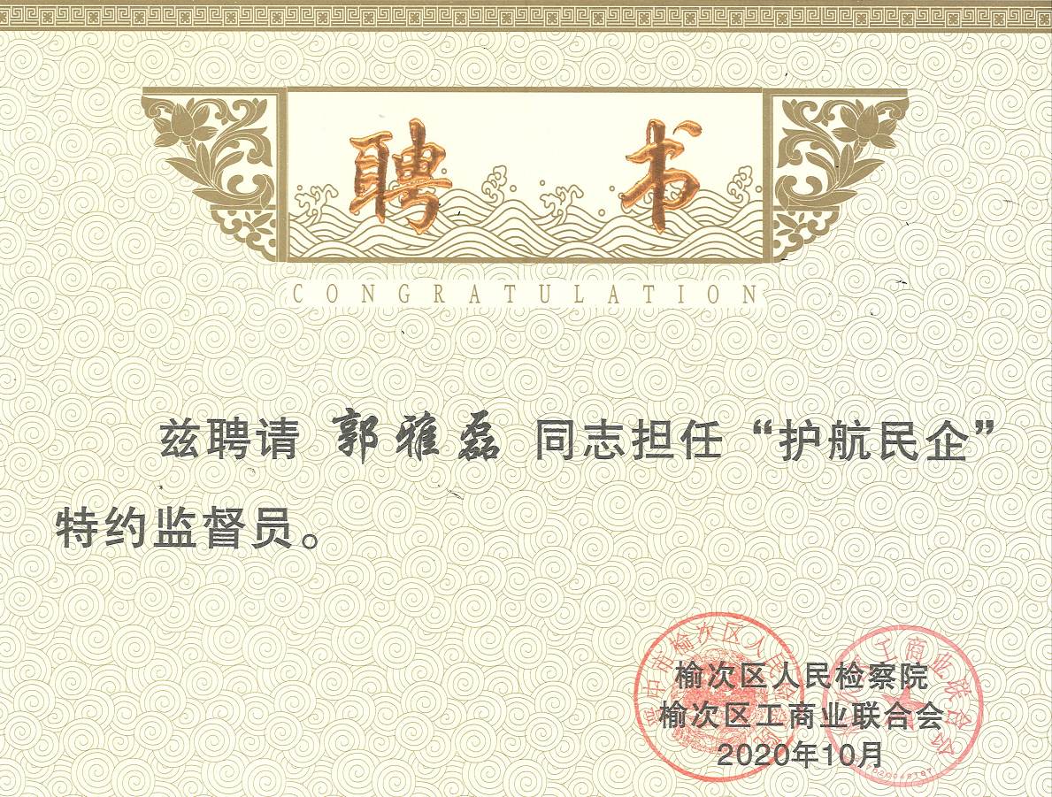 集團(tuán)總裁郭雅磊受聘為“護(hù)航民企”特約監(jiān)督員,耿檢察長為郭總頒發(fā)聘書